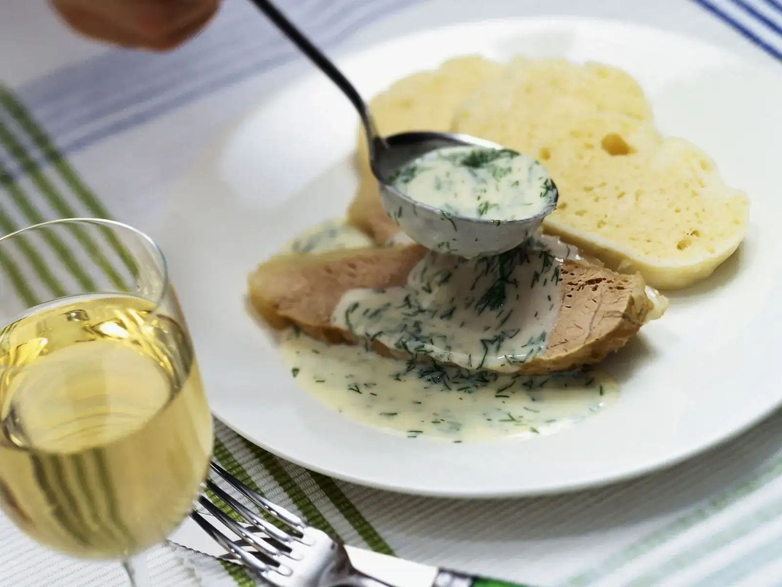 Σε μια κατσαρόλα βράζουμε το κρέας σε αλατισμένο νερό και το αφήνουμε για 1 ώρα. Προσθέτουμε το κρεμμύδι, τα φύλλα δάφνης, τους κόκκους μουστάρδας, το αρωματικό πιπέρι, τον κόλιανδρο, το πιπέρι, τα λαχανικά και τα αφήνουμε για 1 ακόμη ώρα. Αφαιρούμε το κρέας και το τυλίγουμε σε αλουμινόχαρτο. Σε ενα τηγάνι, ζεσταίνουμε το βούτυρο και καβουρντίζουμε το αλεύρι, προσθέτουμε το γάλα, την κρέμα, το ζωμό και τα αφήνουμε να σιγοβράσουν για 10 λεπτά. Τέλος, προσθέτουμε το αλάτι, το πιπέρι, τον χυμό λεμονιού, την σάλτσα σόγιας, και το μοσχοκάρυδο.